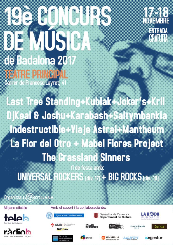 Ens complau anunciar que un cop validat el vot dels jutges, les bandes seleccionades del XIX Concurs de Música de Badalona són: Categoria Millor Banda de Badalona: Last Tree Standing (stoner) Kubiak (punk rock) Kril (stoner-grunge) DjKeal & Joshu (rap) Mantheum (metal) Indestructible (hard rock) Viaje Astral (pop electrónic) Categoria Millor banda en